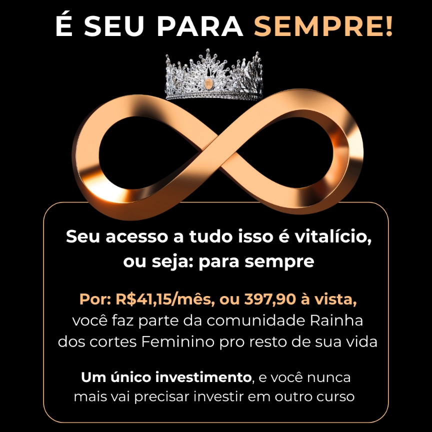Essa oferta não vai se repetir. É a sua chance de entrar para a Comunidade Rainha dos Cortes Femininos com uma condição exclusiva e acesso vitalício.